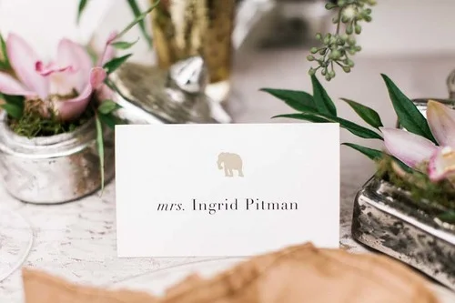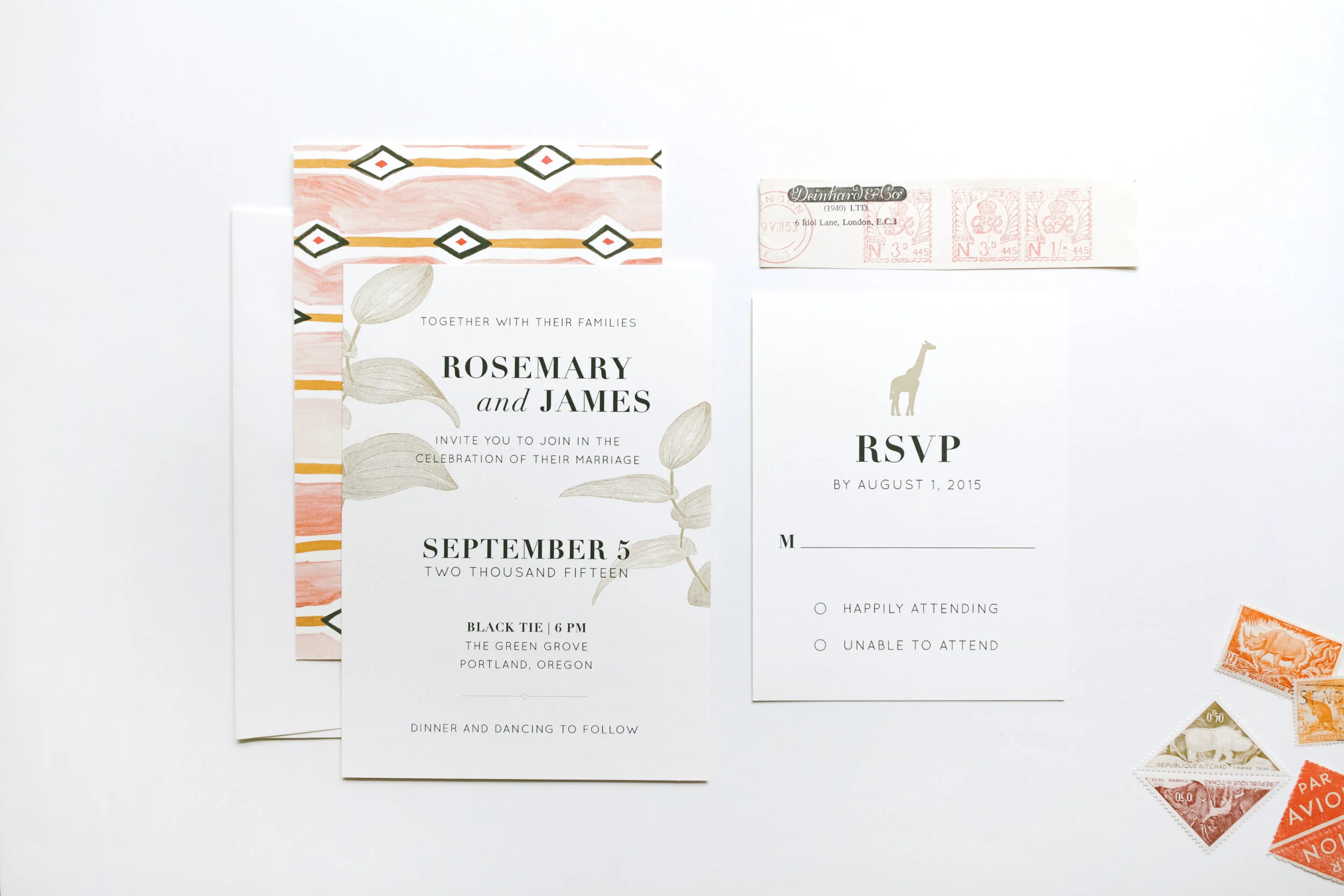 When I was invited to be part of this photo shoot, I knew it would a great chance to mix a bold watercolor pattern, elegant typography, and botanical illustrations. To hint at the safari theme, a gold giraffe silhouette sits atop the RSVP card and vintage postage stamps adorn the envelopes. (See the Magnolia Rouge post for vendor details.)